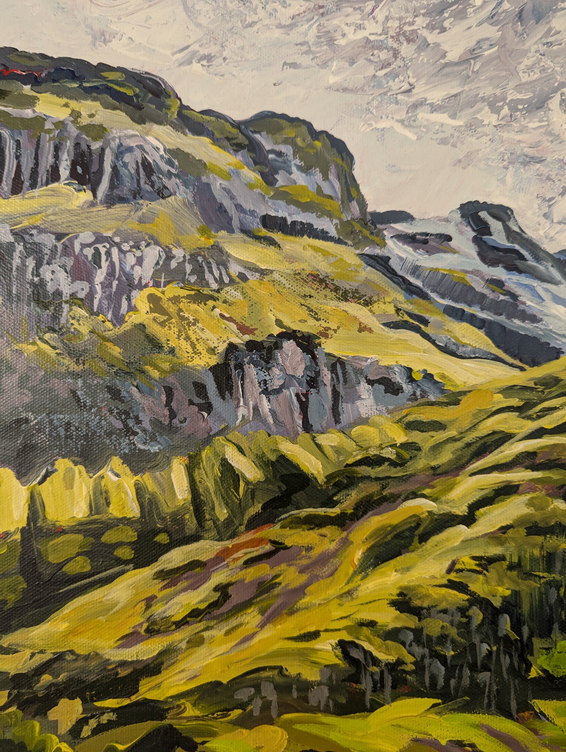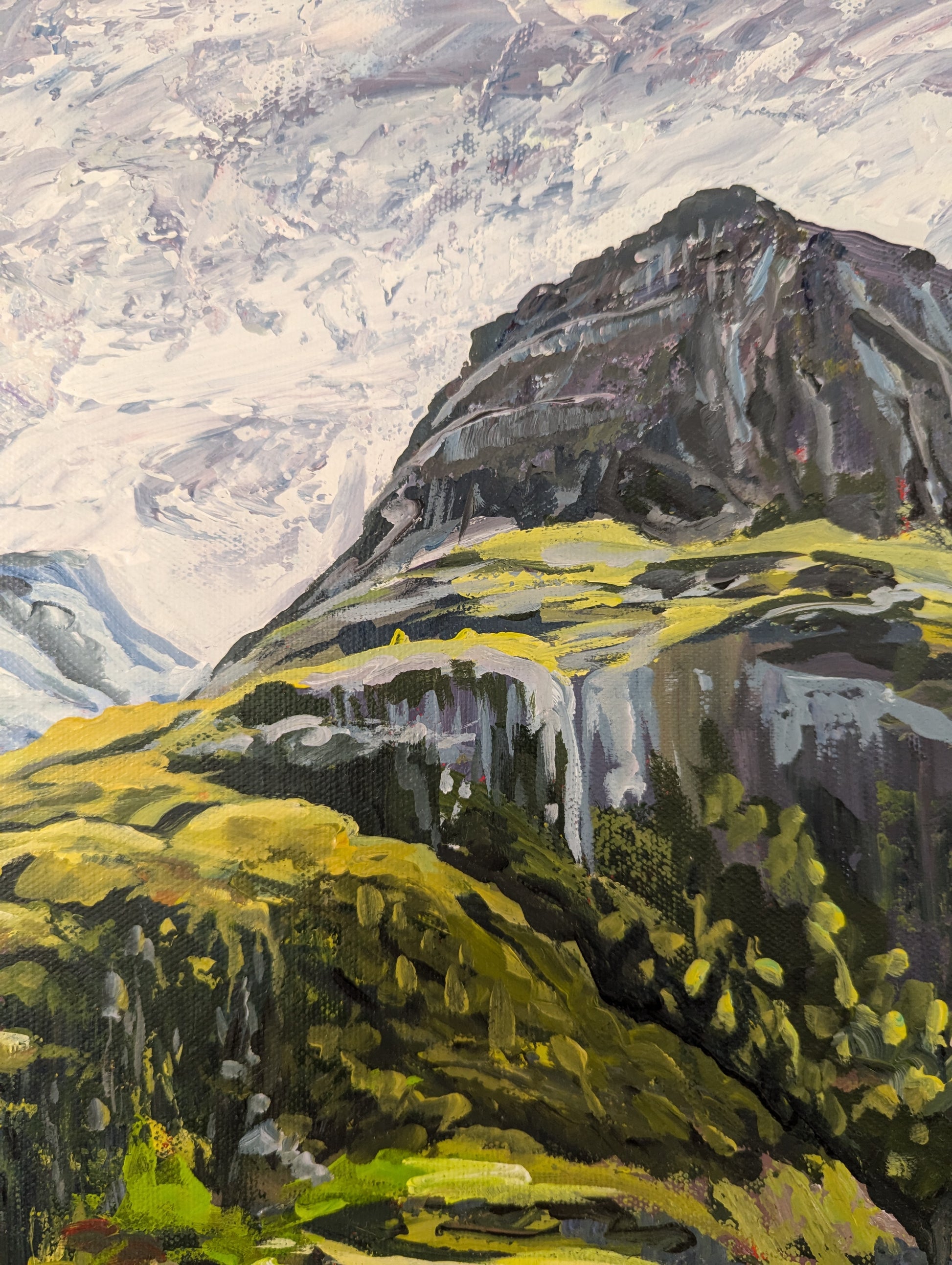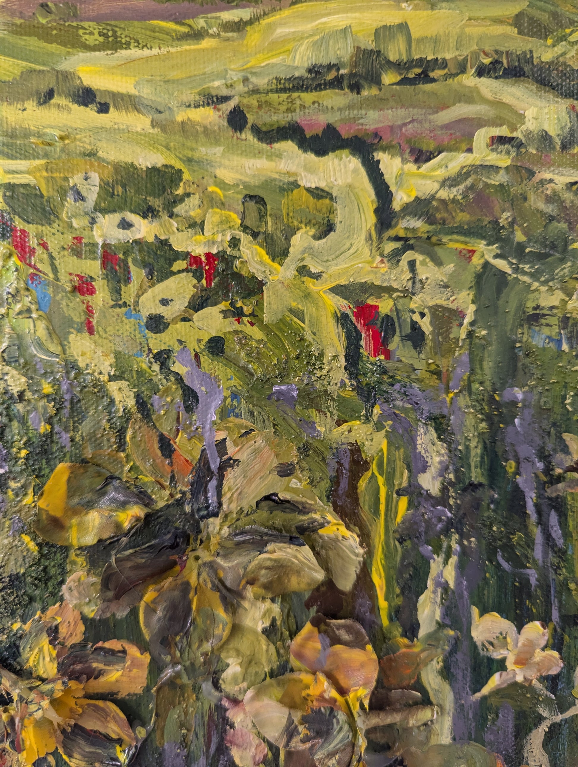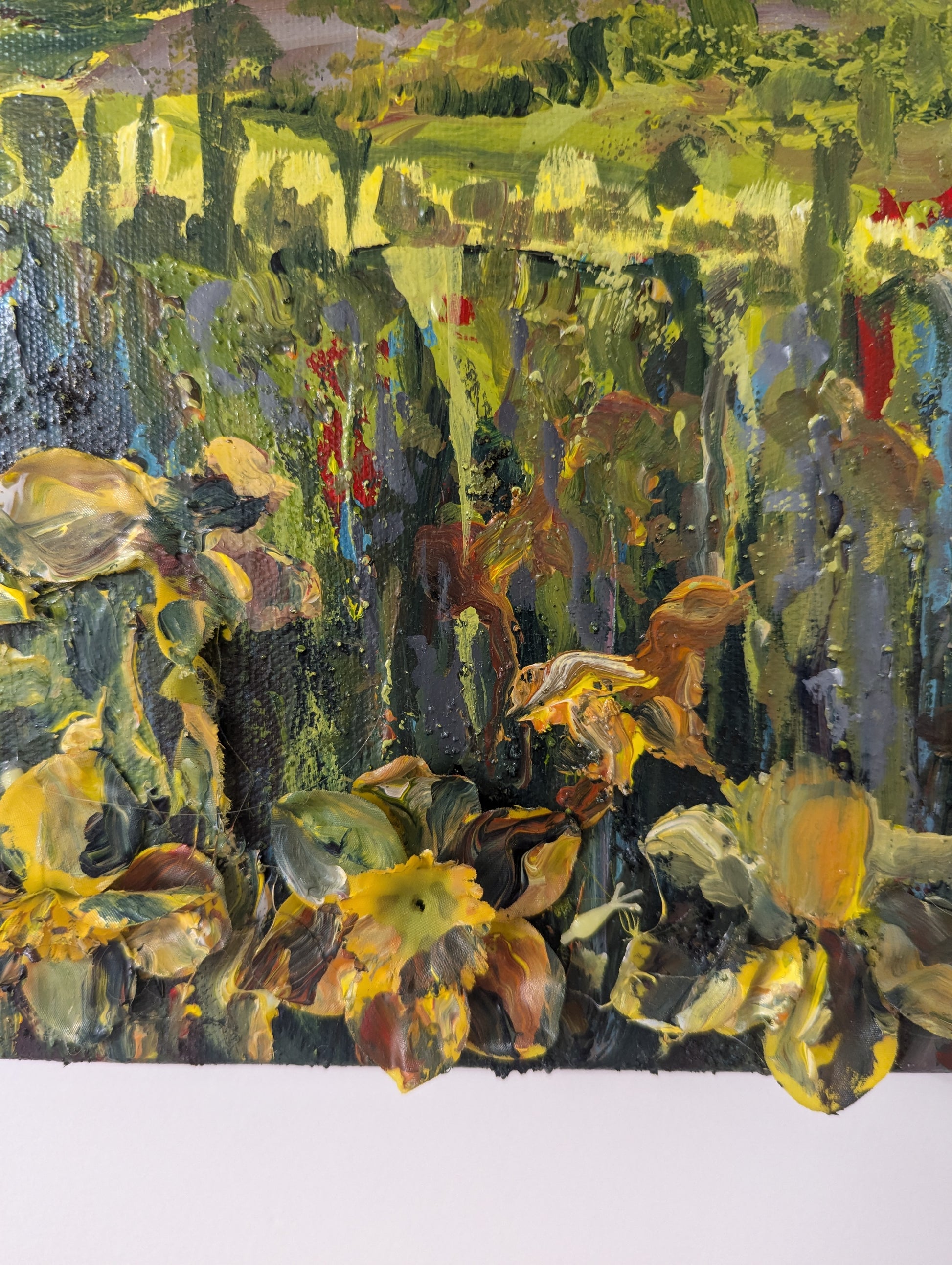 Acrylic paint with fake daffodils and coffee grinds mixed into the paint in the lower half of the canvas.